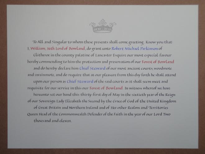 Today’s Lord of Bowland no longer owns land, but he does retain a number of ancient rights. These include the rights to appoint a Chief Steward (known formerly as a Master Forester) and to appoint one or more Bowbearers, a ceremonial attendant who by tradition accompanied the Lord of Bowland during hunting but in later centuries became an officer of the Lord's forest courts. In 2010, Robert Parker of Browsholme Hall was appointed Bowbearer of the Forest of Bowland, the first in almost 150 years. Clitheroe surveyor Michael Parkinson served as Chief Steward of the Forest of Bowland between 2009-19. His successor, Mike Pugh, Chair of Champion Bowland, was installed as 21st Steward in October 2019. By custom, the Lord of Bowland is also known as The Lord of the Fells.